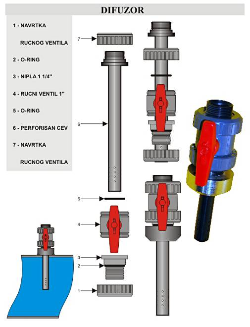 Pozicija difuzora obezbeđuje da se dezinfekciono sredstvo ubrizga u sredinu cevovoda i tako postigne brže i potpunije umešavanje dezinfektanta.